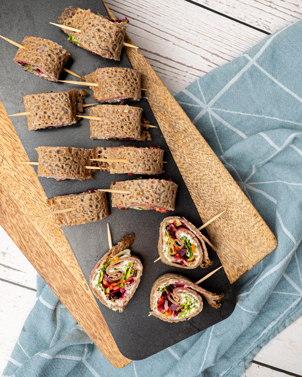 Ces makis allient la texture croustillante de la galette de sarrasin à l’onctuosité d’un fromage fouetté et à la fraîcheur de légumes croquants de saison (carottes, courgettes, poivrons, etc.).